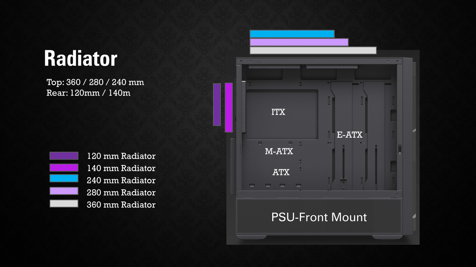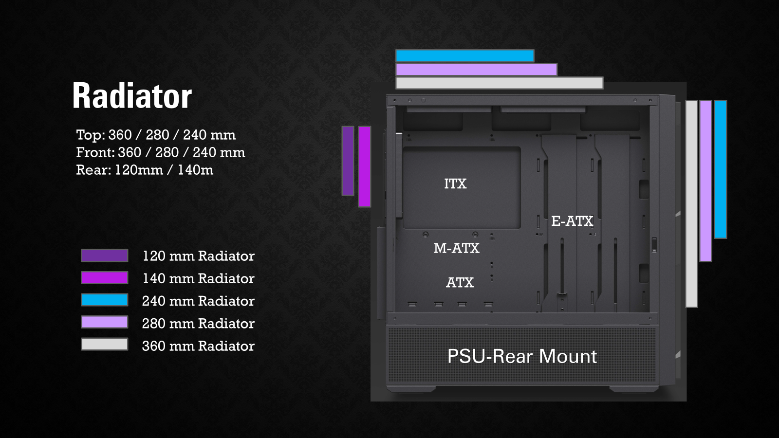 PSU Rear-Mount: Top : Up to 360 mm / 280mm / 240mm Front : up to 360 mm / 280 mm / 240 mm Rear : up to 140 mm / 120 mm PSU Front-Mount: Top : Up to 360 mm / 280mm / 240mm Rear : up to 140 mm / 120 mm |