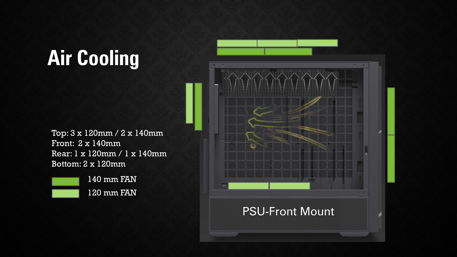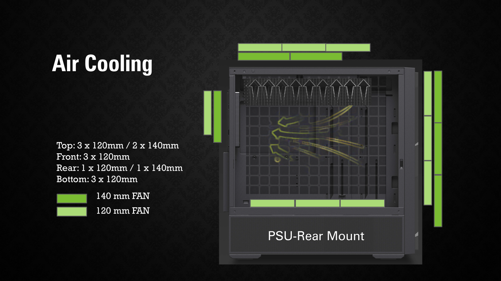 PSU Rear-Mount: Top : 12cm x3 / 14cm x2 ; Bottom : 12 cm x 3 Front : (12cm / 14cm) x 3 ; Rear : (12 cm or /14 cm) x1 PSU Front-Mount: Top : 12cm x3 / 14cm x2 ; Bottom : 12 cm x 2 Front : 14cm x 2 ; Rear : (12 cm or /14 cm) x1 |