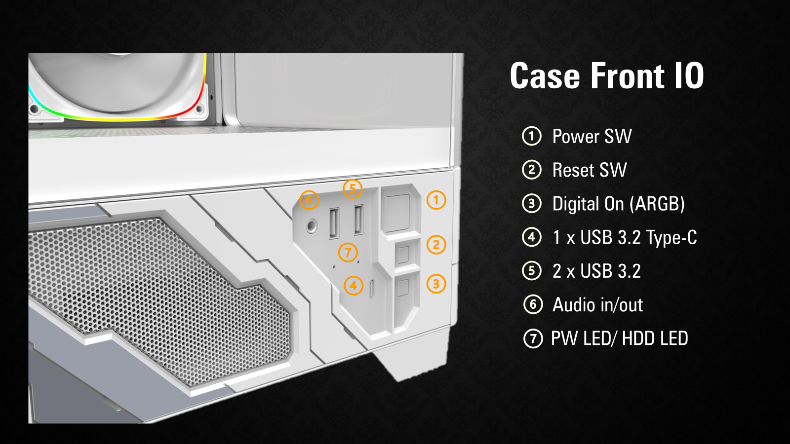 USB 3.2 x 2、USB3.2_Type C x 1 HD Audio x 1 Power/Reset/ARGB SW Power LED / HDD LED |