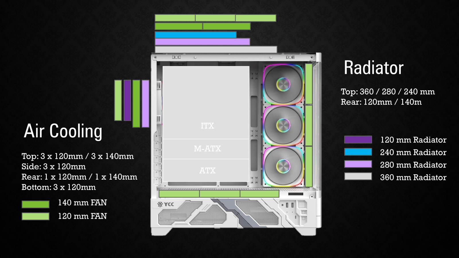 | Motherboard Compatibility | ATX、M-ATX、ITX;Rear-Mounted: M-ATX、ATX |