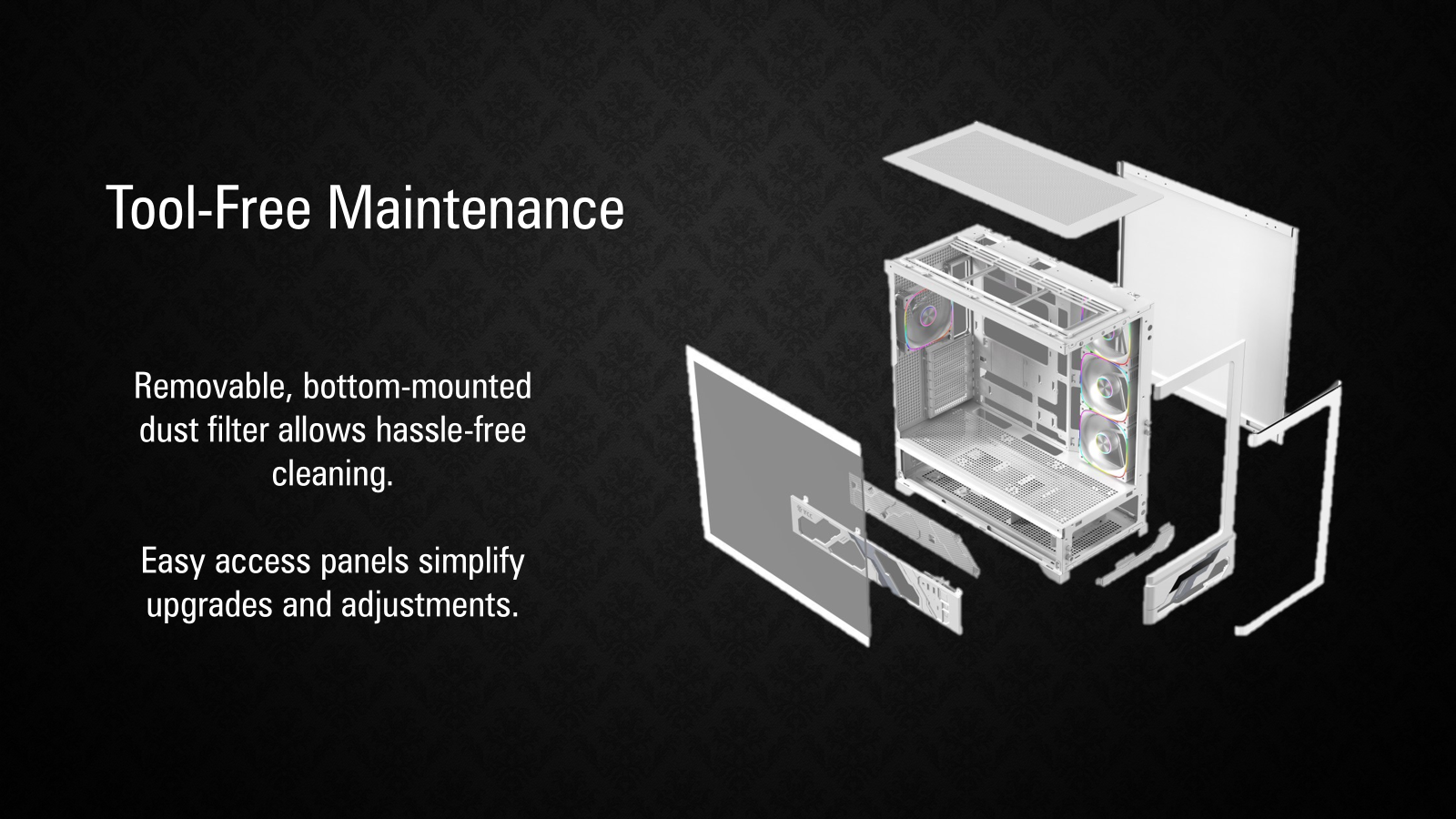 • CPU Air coolers up to 180mm Height • Supports 7 expansion slots, including an upright GPU bracket • Advanced Cooling radiators up to 360mm (Top) & 140mm (Rear) • Tool-Free Maintenance with Removable Panels • Easy Maintenance with bottom-mounted dust filter |