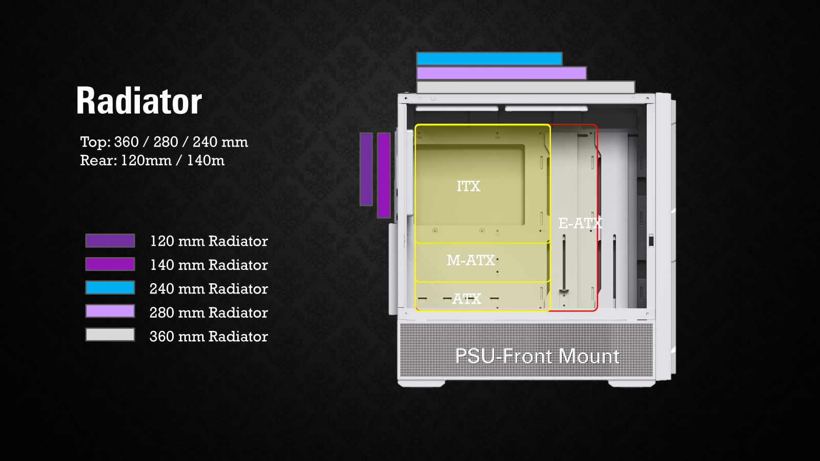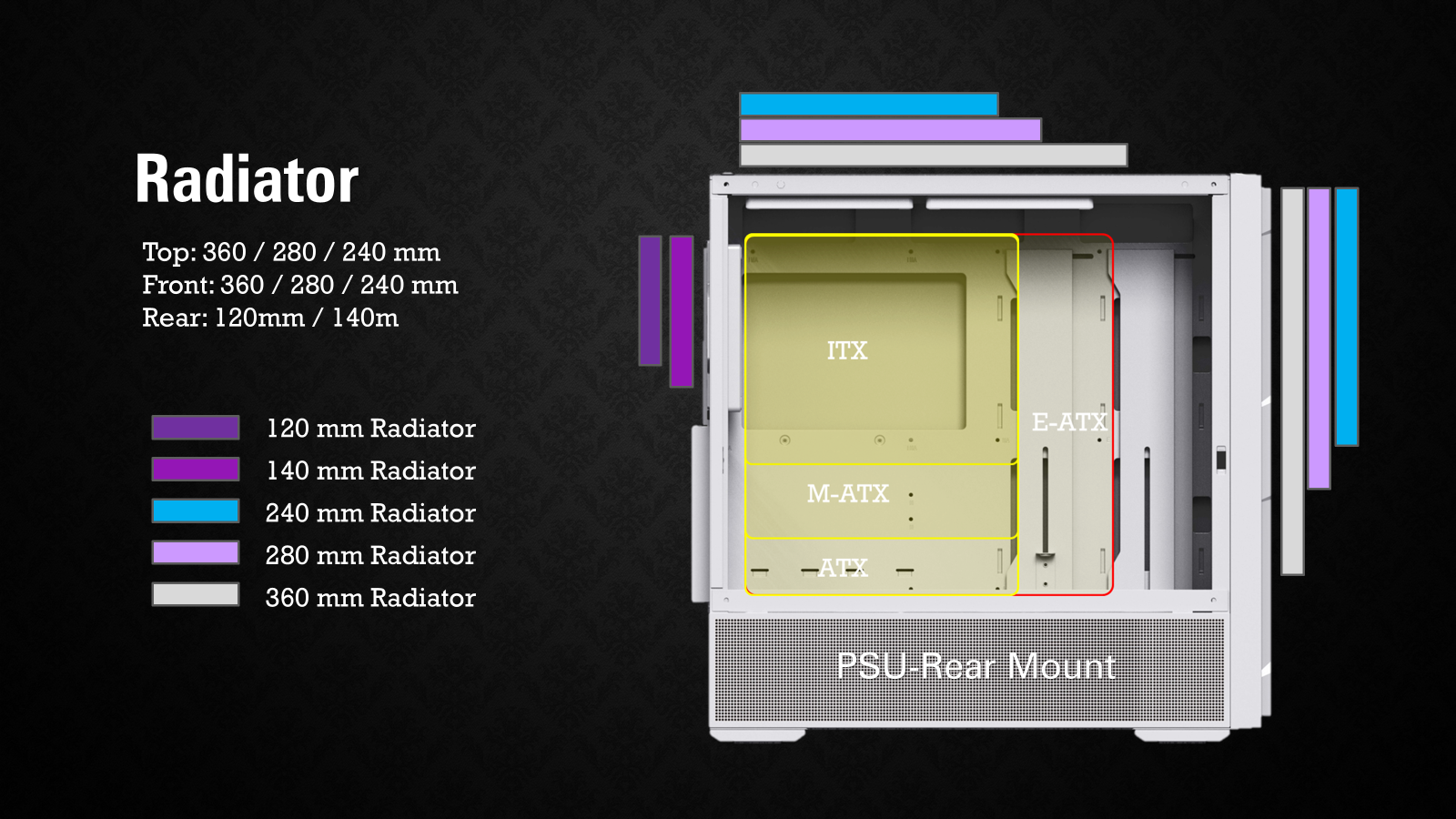 PSU Rear-Mount: Top : Up to 360 mm / 280mm / 240mm Front : up to 360 mm / 280 mm / 240 mm Rear : up to 140 mm / 120 mm PSU Front-Mount: Top : Up to 360 mm / 280mm / 240mm Rear : up to 140 mm / 120 mm |