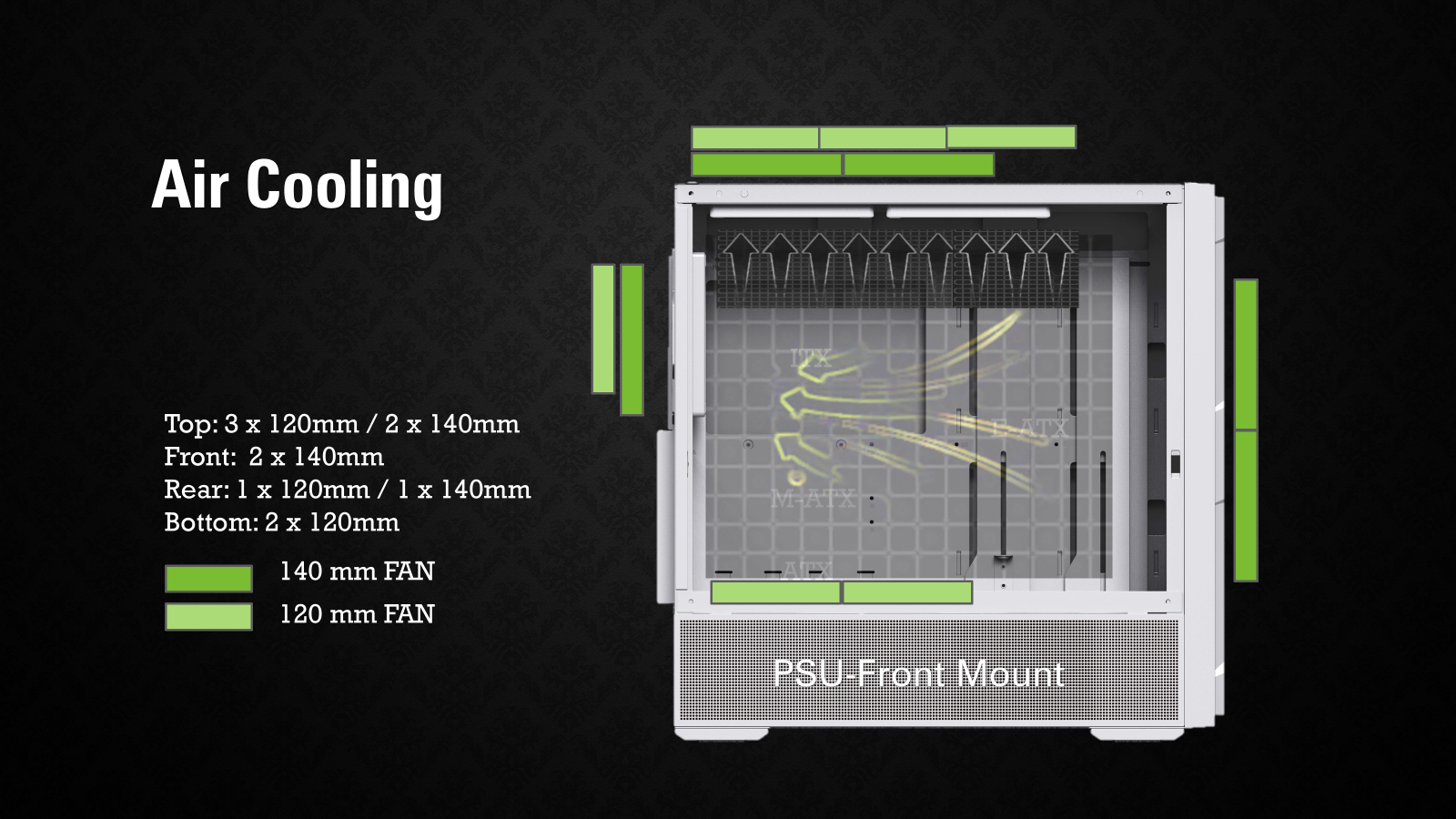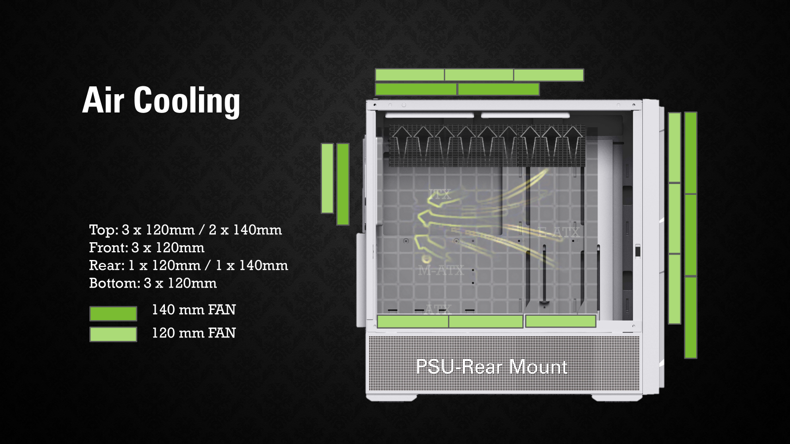 PSU Rear-Mount: Top : 12cm x3 / 14cm x2 ; Bottom : 12 cm x 3 Front : (12cm / 14cm) x 3 ; Rear : (12 cm or /14 cm) x1 PSU Front-Mount: Top : 12cm x3 / 14cm x2 ; Bottom : 12 cm x 2 Front : 14cm x 2 ; Rear : (12 cm or /14 cm) x1 |